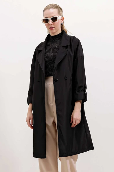 Çift Sıra Düğmeli Biye ve Kemerli Siyah Kadın Trençkot