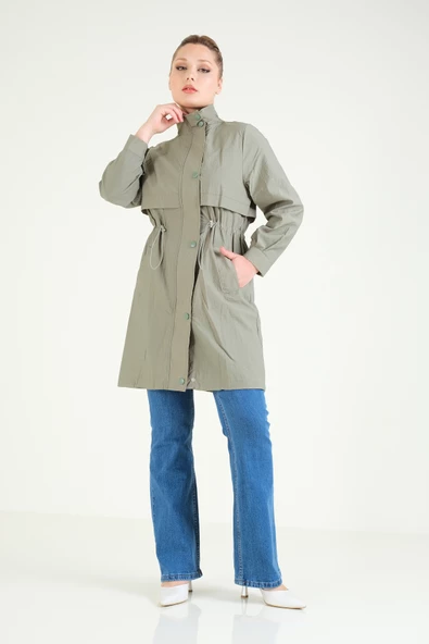 Kadın Paraşüt Kumaş Bel Lastikli Trençkot Haki