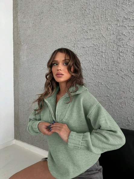 Fermuarlı Yakalı Kazak - Çağla Yeşili