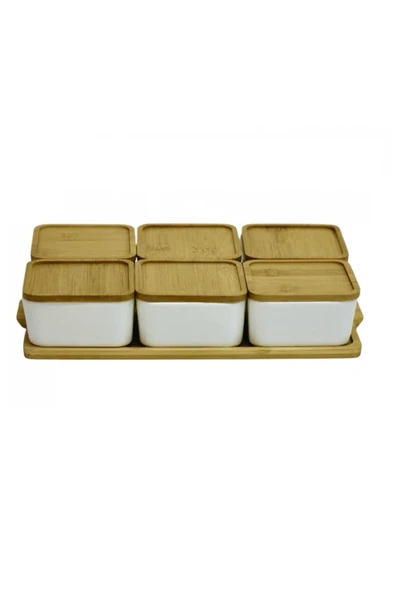 BUENOS Bambu Kapaklı Porselen Kare 6'lı Tepsili Kahvaltılık Sunum Seti