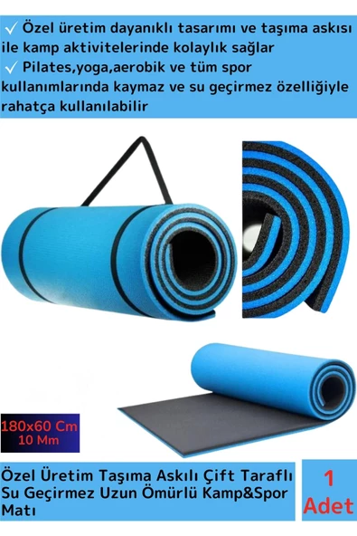 Özel Üretim Taşıma Askılı Çift Taraflı Kaymaz Su Geçirmez Pilates Kamp Fitness Yoga Matı Mavi 10 Mm