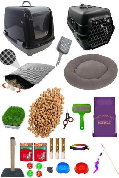 Pribor Kedi Başlangıç Seti Kapalı Tuvaletli Lüx 20 Parça Siyah-gri