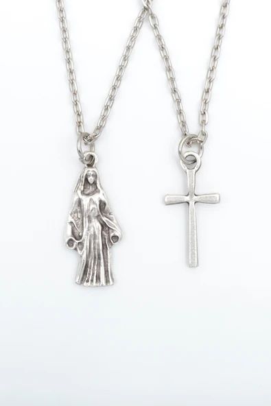 2'li Meryem Ana - Minimal Haç Gümüş Kaplama Kolye Seti