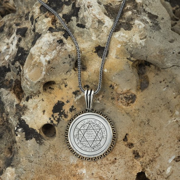 Grek Motifli Yuvarlak Hz. Süleyman Mührü Gümüş Erkek Kolye