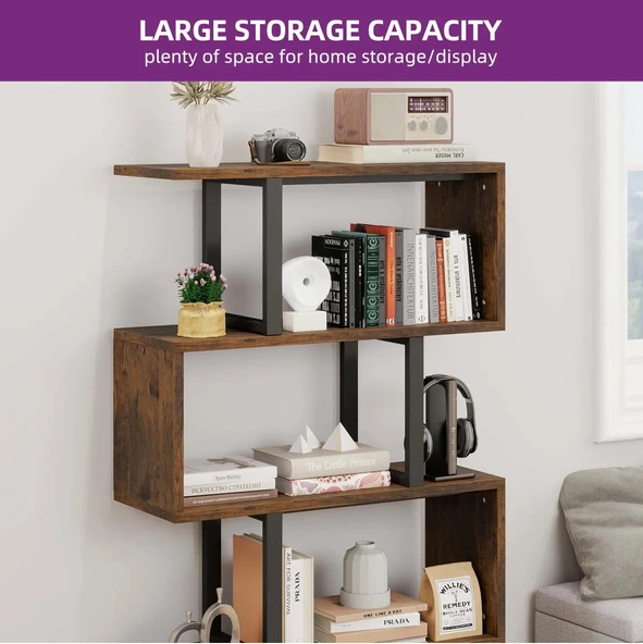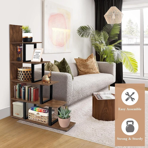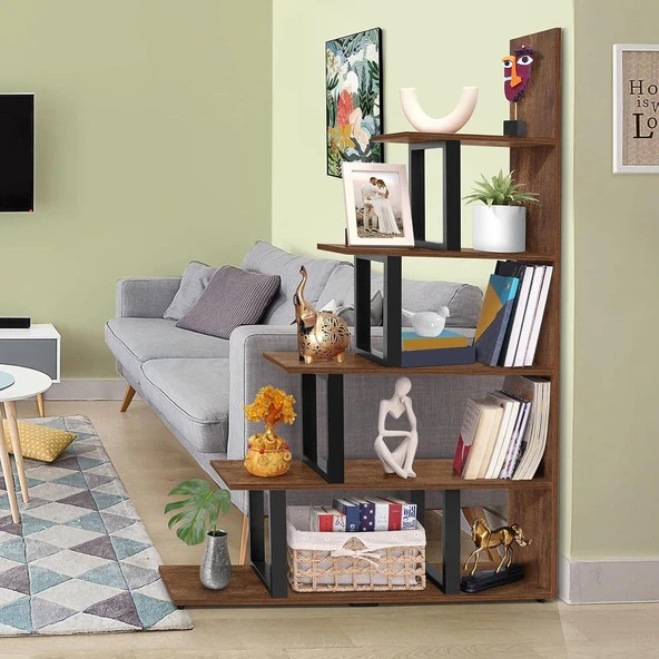 Metal Ahşap Kitaplık Dekoratif 5 Raflı Ofis Kitaplığı Kitap Dosya Rafı Çiçeklik Rafı Dekorasyon