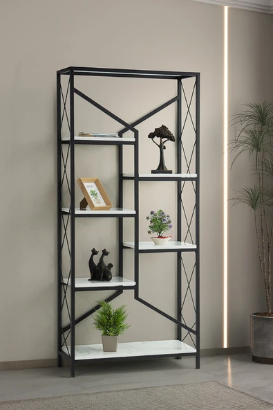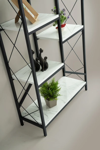 Evdesa Metal Kitaplık Dekoratif Raf Ev Ofis Rafı Kitap Dosya Rafı 5 Raflı Beyaz Mermer Kitaplık !80*90