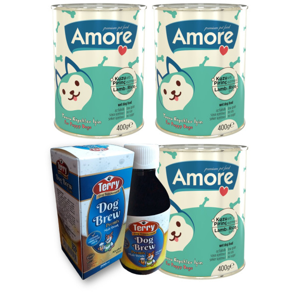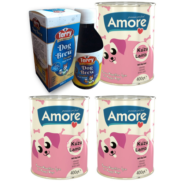 Amore Kuzu Etli Pate Yavru Köpek 3-Konservesi, Terry Dog Brew Premiks D-Biotin Taurin 200ml Malt İçeceği
