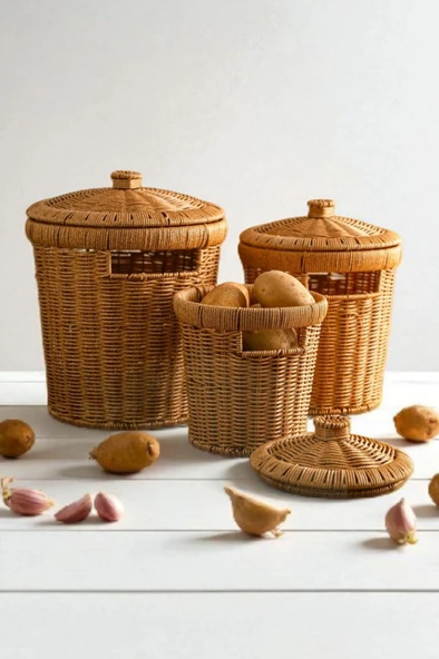 3'lü Patates Soğan Sarımsak Sepeti Seti - Rattan Dekoratif ve Düzenleyici Kapaklı Sebzelik Soğanlık Set
