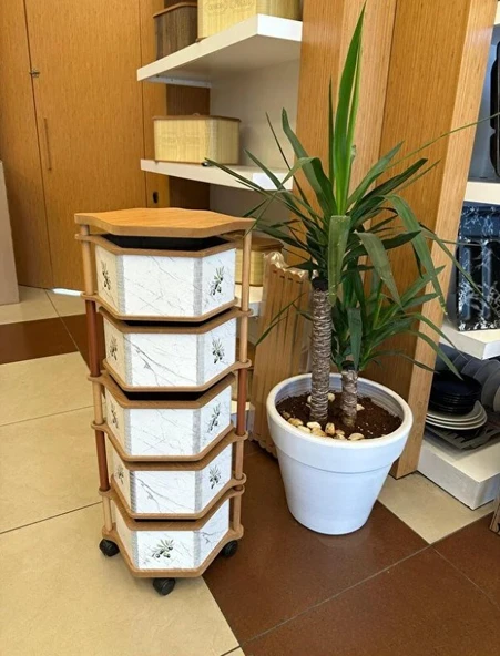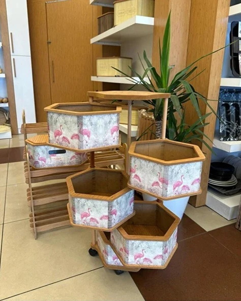 Ahşap Altıgen Sebzelik 5 Katlı Yana Açılır Patates Soğan Tekerlekli Sebzelik Flamingo
