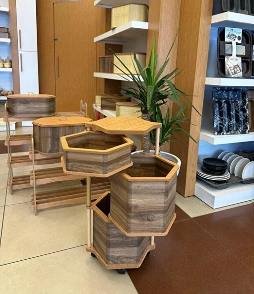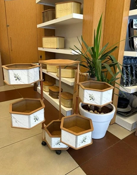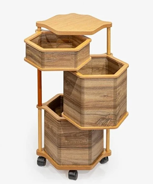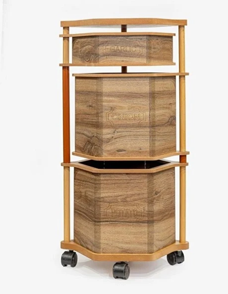 Ahşap Altıgen Tekerlekli Kahve Sebzelik 3 Katlı Yana Açılır Patates Soğan Sarımsak