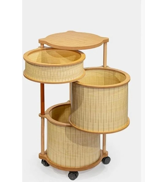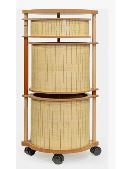 Ahşap Yuvarlak Tekerlekli Sebzelik 3 Katlı Yana Açılır Patates Soğan Sarımsak Krem