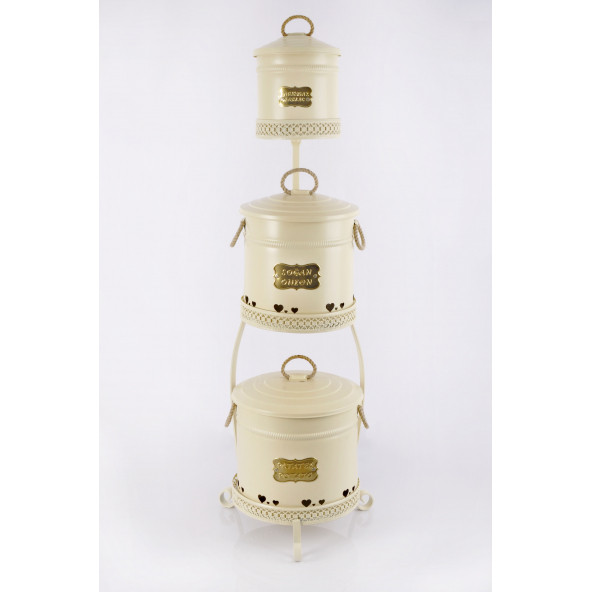 Galvaniz Dantel Desen Metal Standlı 3 Katlı Patates Soğan Sarımsak Kovası Büyük Boy Krem 1052
