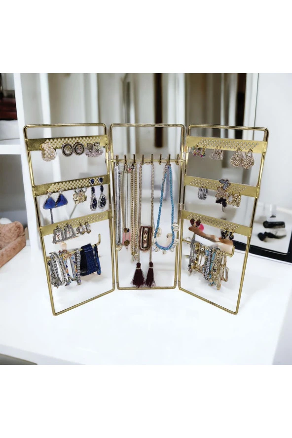Dekoratif Takı Standı Takı Düzenleyici Organizeri Kutusu 3 Parça Kolye Yüzük Küpelik Model-2 Gold