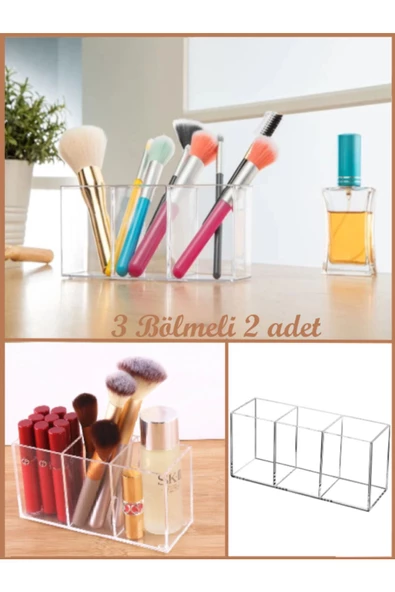 2 Adet Kristal 3 Bölmeli Organizer Takımı AK765- Makyaj Fırçası Ruj Düzenleyici