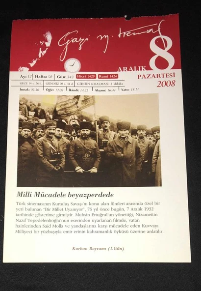 GAZİ MUSTAFA KEMAL Görselli 1 ARALIK 2008 PAZARTESİ Takvim Yaprağı (Sahafiye Kitap)