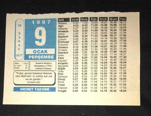9 OCAK 1997 PERŞEMBE HİCRET TAKVİMİ YAPRAĞI (Sahafiye Kitap)