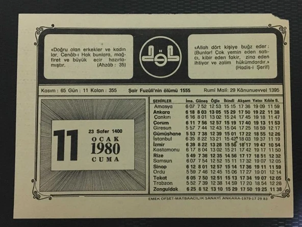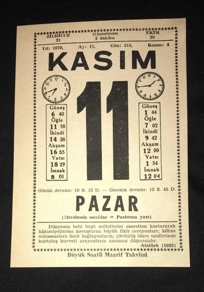 11 KASIM 1979 PAZAR Büyük Saatli Maarif Takvimi YAPRAĞI (Sahafiye Kitap)