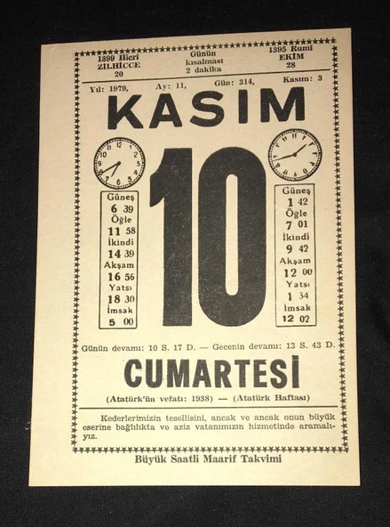 10 KASIM 1979 CUMARTESİ Büyük Saatli Maarif Takvimi YAPRAĞI (Sahafiye Kitap)