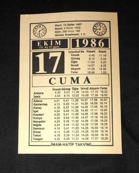 17 EKİM 1986 CUMA İMAM-HATİP TAKVİMİ YAPRAĞI (Sahafiye Kitap)