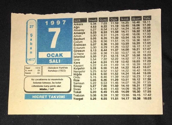 7 OCAK 1997 SALI HİCRET TAKVİMİ YAPRAĞI (Sahafiye Kitap)