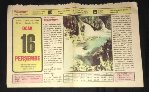 16 OCAK 1975 HÜRRİYET TAKVİM YAPRAĞI (Sahafiye Kitap)