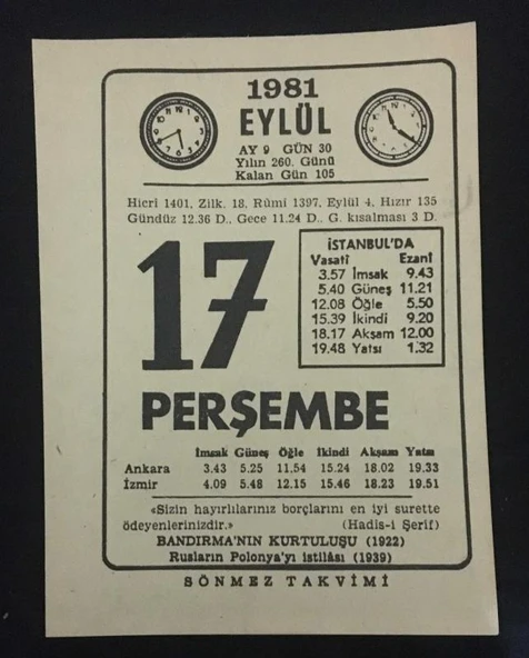 17 EYLÜL 1981 PERŞEMBE Sönmez Takvimi YAPRAĞI (Sahafiye Kitap)