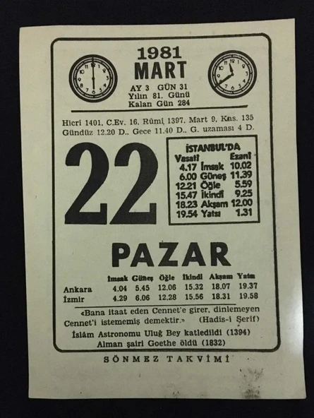 22 MART 1981 PAZAR Sönmez Takvimi YAPRAĞI (Sahafiye Kitap)