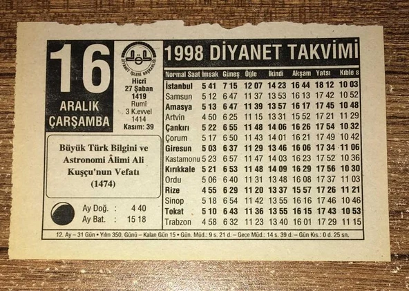 16 Aralık 1998 ÇARŞMABA Diyanet Takvim YAPRAĞI (Sahafiye Kitap)