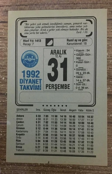 31 Aralık 1992 PERŞEMBE Diyanet Takvim YAPRAĞI (Sahafiye Kitap)