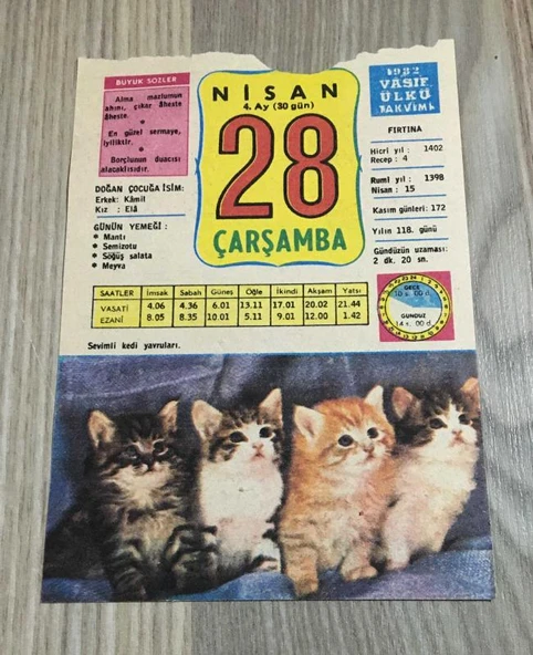 28 NİSAN 1982 ÇARŞAMBA - VASIF ÜLKÜ TAKVİMİ YAPRAĞI (Sahafiye Kitap)