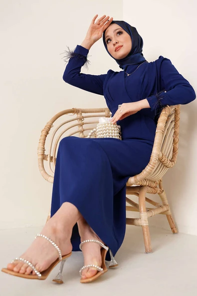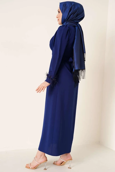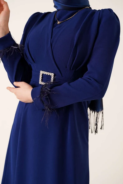 Kol Ucu Tüylü Kemerli Elbise Lacivert