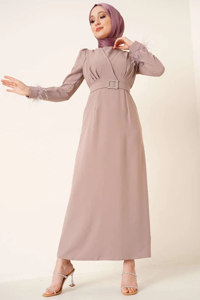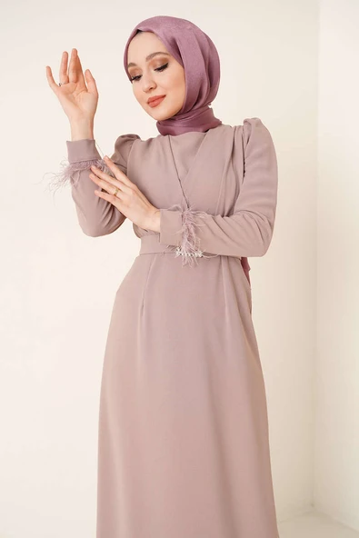 Kol Ucu Tüylü Kemerli Elbise Vizon