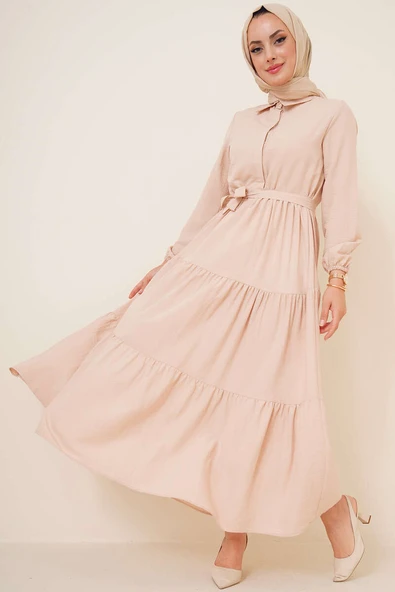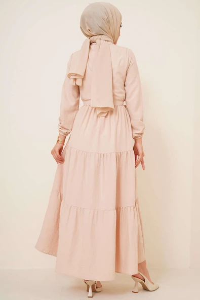 Beli Yarı Lastikli Yarasa Kol Elbise Latte
