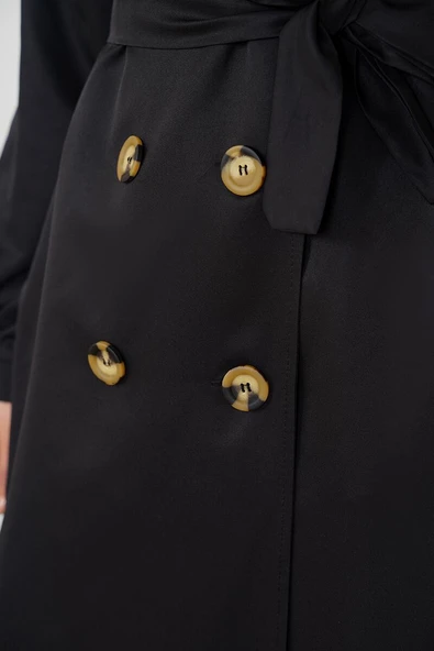 Üç Düğmeli Kruvaze Yaka Siyah Trençkot