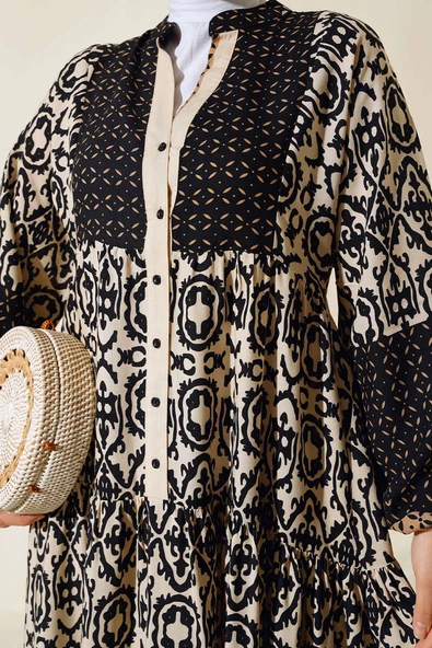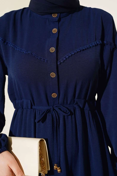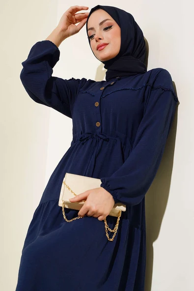 Önü Yarım Düğmeli Kat Kat Elbise Lacivert