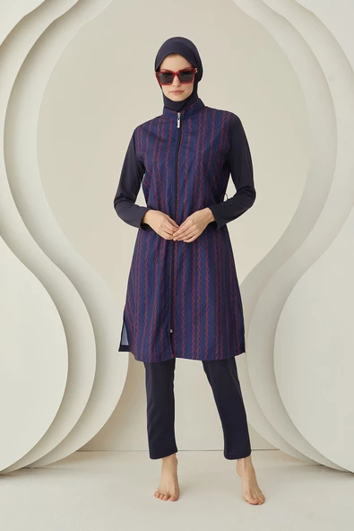 Lacivert Çizgi Desenli Dokuma Tesettür Mayo