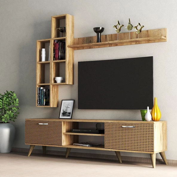 Mega 180 lik Kitaplıklı Raflı Tv Ünitesi Çam Hazeran Kapaklı - TVU0304