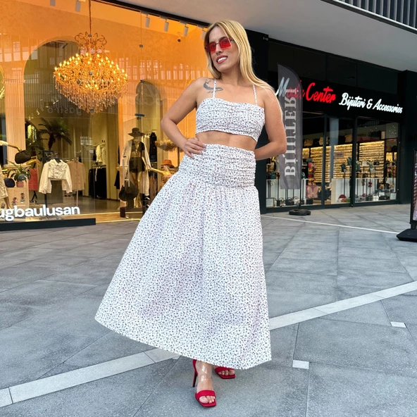 - Beyaz Üzeri Kırmızı Mavi Çiçekli Etek Büstiyer Takım