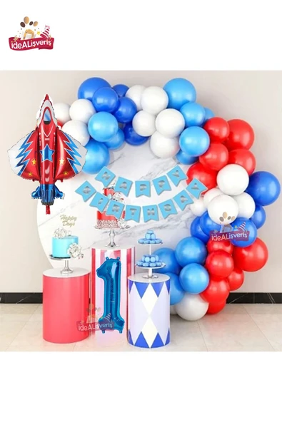 Bkmc Jet Uçak Mavi 1 Yaş Folyolu Kırmızı Beyaz Mavi Balon Zincir Doğum Günü Seti