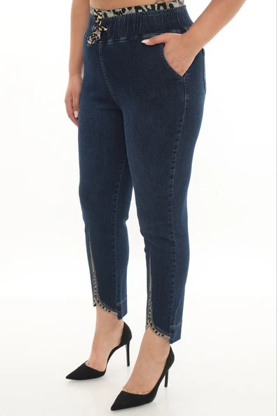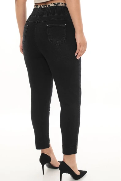 Büyük Beden Kadın Dar Paça Leopar Taş Detaylı Lastikli Yüksek Belli Toparlayıcı Pantolon