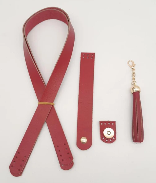 Çanta Aksesuar Kırmızı Gerçek Deri 70x2.3 cm Çift Saplı Püsküllü Çanta Seti Light Gold Metalli