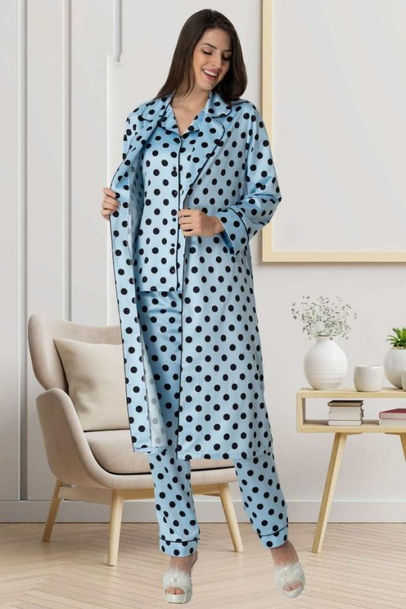 Carpediem 1552 Puantiyeli Saten Mavi Sabahlıklı Lohusa Pijama Takımı