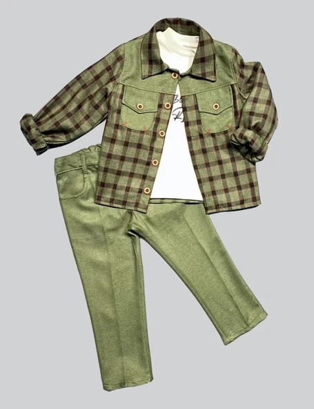 Cepli Pantolon Ekose Gömlek Uzun Kollu Sweat 3lü Erkek Çocuk Takımı Yeşil