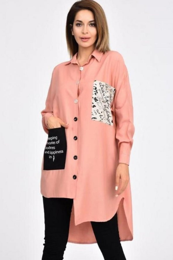 Cepli ve Baskılı Uzun Kollu Somon Kadın Gömlek