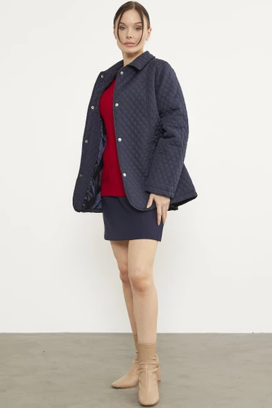 Çıt Çıtlı Gömlek Yaka Kapitone Mont - Lacivert