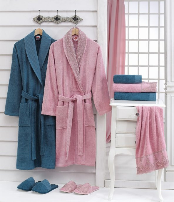Ana Sayfa Ev Dekorasyon Ev Tekstili Banyo Tekstili Cotton Box Bambu Güpürlü Aile Bornoz Seti G.Kurusu-Mavi