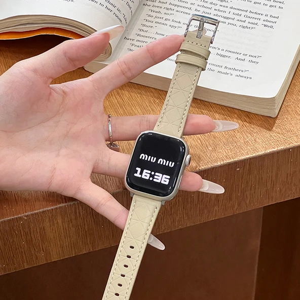 Deri Ekose Desenli Apple Watch Kordonu - Ultra1/2 49mm - Yulaf Ezmesi