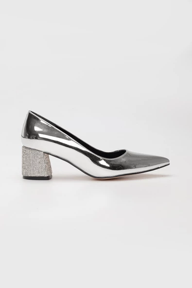Dilimler Ayakkabı Rugan Taşlı Gümüş Kadın Kısa Topuklu Ayakkabı