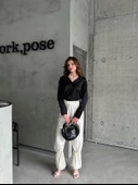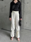 - Ekru Paçası Bağlama Detaylı Saten Pantolon