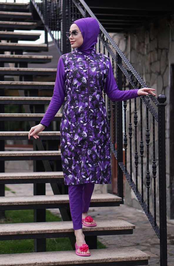 Emayo Tam Kapalı Tesettür Mayo Deniz Mayosu 2003 Desenli Ruken Mor2
